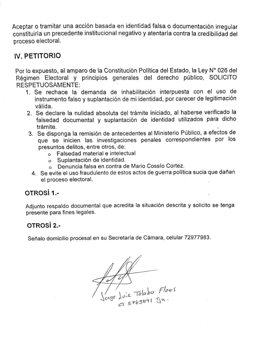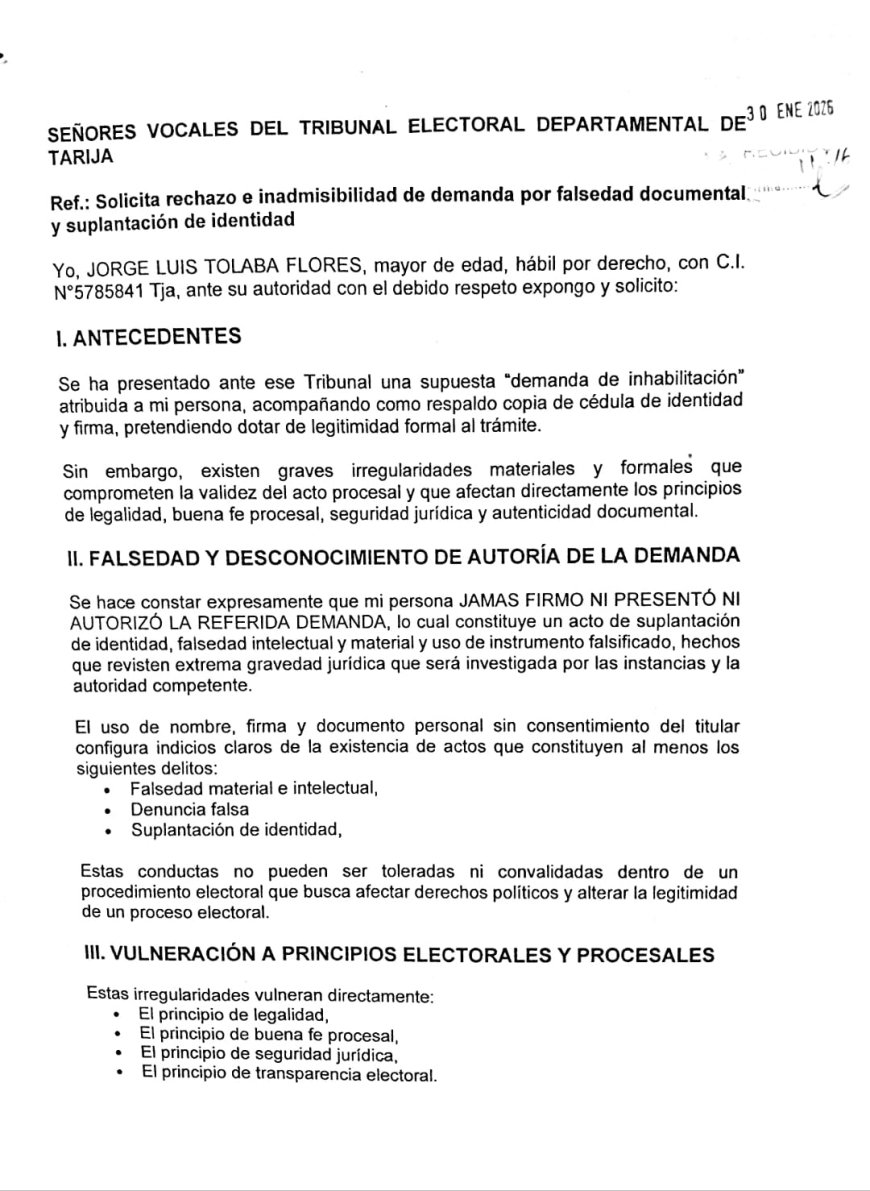 Según el documento ingresado al TED, Jorge Luis Tolaba Flores manifestó de manera expresa que nunca firmó, presentó ni autorizó la demanda de inhabilitación que fue atribuida a su persona, denunciando que se habría utilizado su nombre, firma y copia de su cédula de identidad sin su consentimiento, con el objetivo de dar apariencia de legalidad al trámite.