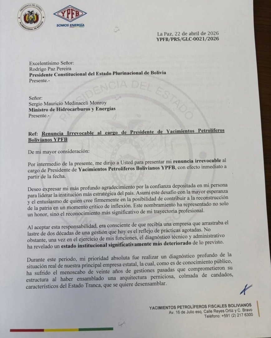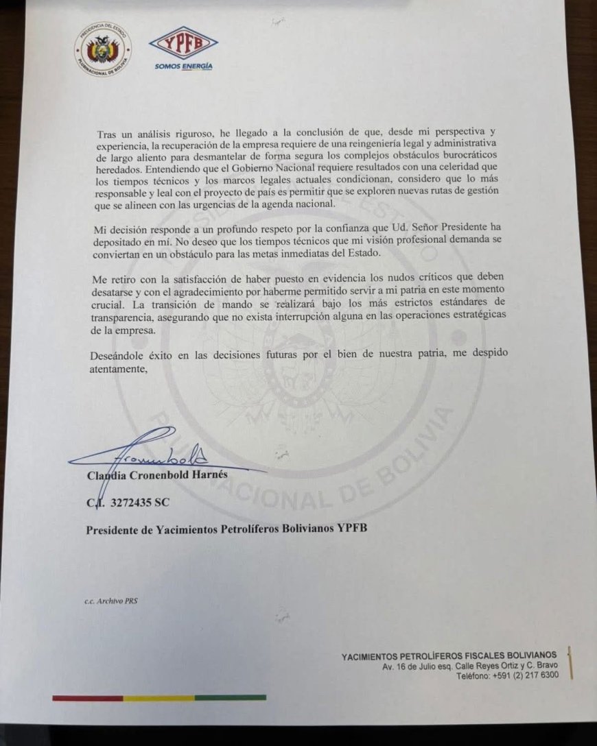 En una carta oficial fechada en La Paz, la ahora exautoridad presentó su dimisión con efecto inmediato, dirigida tanto al mandatario como al ministro de Hidrocarburos. En el documento, Cronembold agradece la confianza depositada en su persona, pero señala que el diagnóstico realizado durante su breve gestión evidenció un “estado institucional significativamente más deteriorado de lo previsto”.