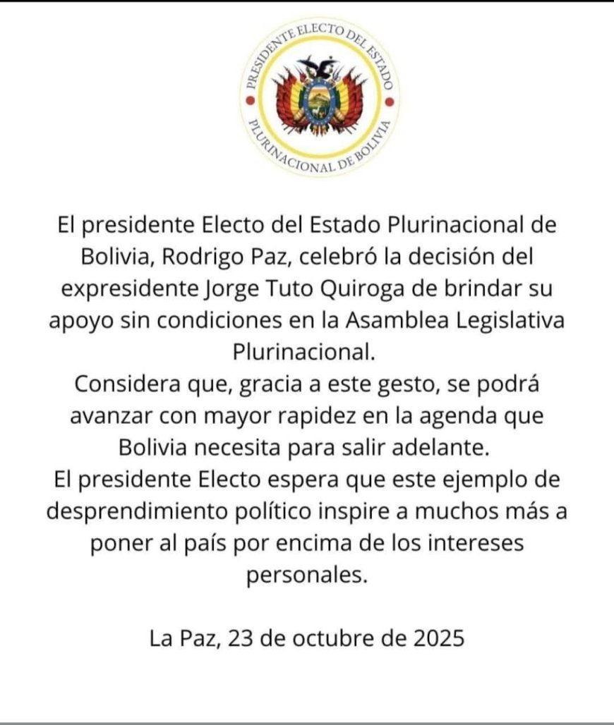 El presidente electo de Bolivia, Rodrigo Paz Pereira, expresó su agradecimiento al expresidente y excandidato presidencial Jorge Tuto Quiroga por el apoyo sin condiciones que este anunció a su gestión en la Asamblea Legislativa Plurinacional (ALP).