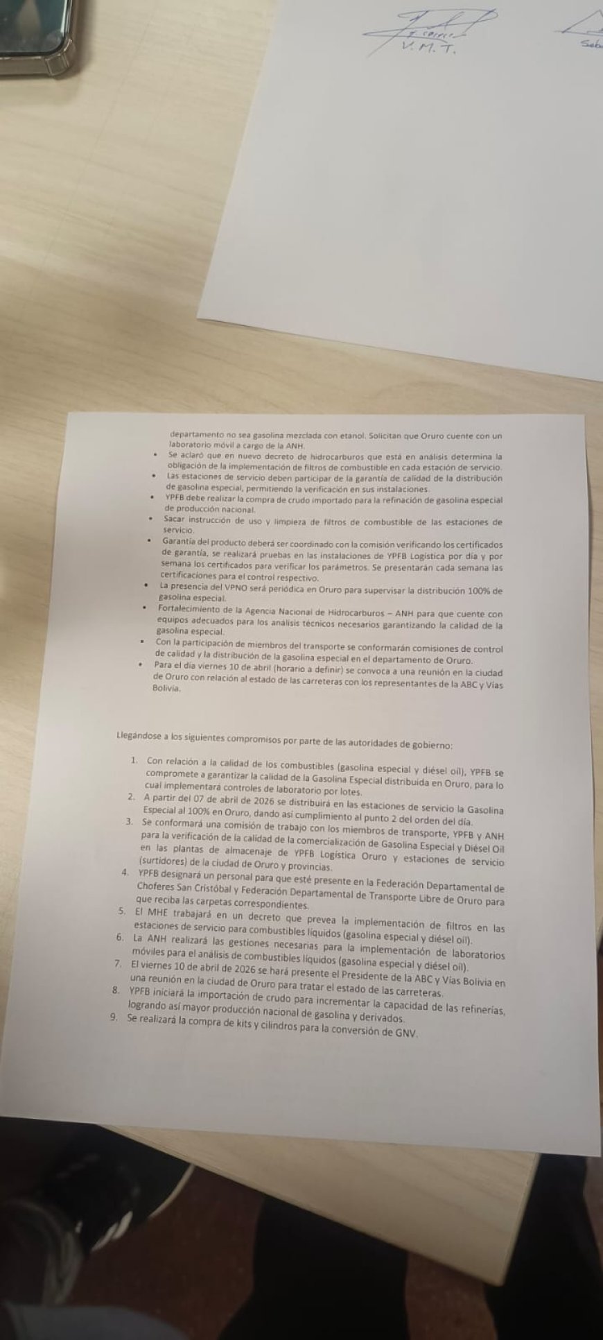 Entre los aspectos más relevantes del acuerdo de diez puntos, se estableció que YPFB garantizará mejoras en la calidad del combustible mediante la suscripción de una adenda para la importación de gasolina con estándares más elevados. Asimismo, se conformará una comisión conjunta entre el sector transporte y la estatal petrolera para realizar controles aleatorios en plantas de almacenamiento y estaciones de servicio.
