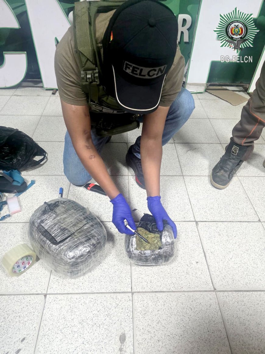 Según el informe oficial, durante la revisión de los pasajeros y su equipaje, los agentes detectaron una mochila de color negro que contenía dos paquetes envueltos con cinta transparente. Al realizar la prueba de campo, el contenido dio resultado positivo (+) para marihuana.